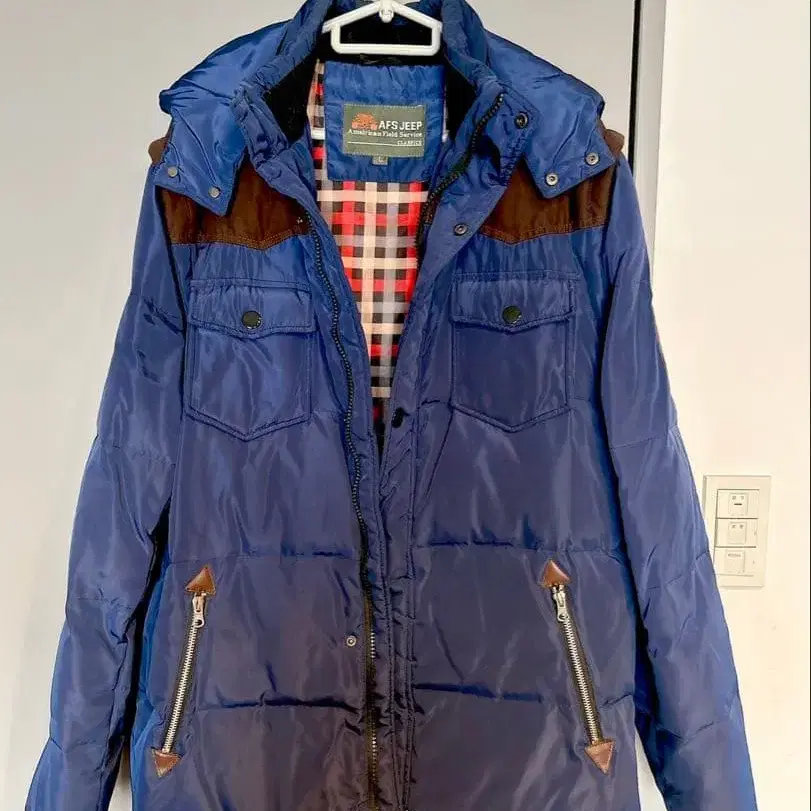 후드 부착 파랑 다운 자켓, 체크 무늬 안감과 스웨이드풍 소재 악센트 부착. - 색상: 파랑 - 소재: 다운 - 디자인: 후드 부착, 체크 무늬 안감 - 포켓: 앞면에 4개의 포켓 - 특징: 옷깃과 팔꿈치 부분에 브라운 스웨이드풍 소재 - 지퍼: 앞면에 지퍼 부착 방문해 주셔서 감사합니다. 색상 - 네이비 계열 얼룩, 찢김, 냄새 등 - 없음