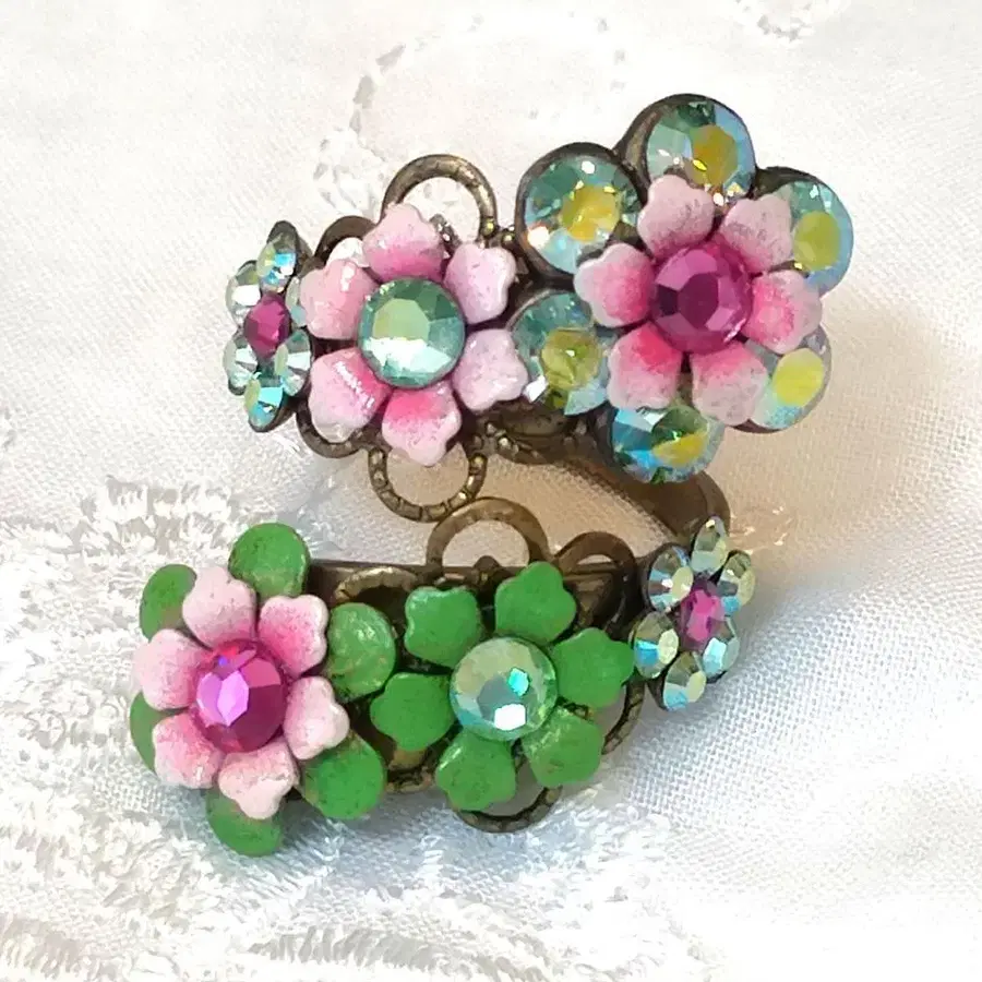 꽃 모티브의 빈티지풍 반지, 스와로브스키 장식이 아름다운 - 색상: 핑크, 그린 - 디자인: 스네이크 반지 핑크와 그린의 조합이 당시 제게는 딱 맞는 첫눈에 반한 디자인이었습니다(T_T) 손가락에 감기는 듯 꽃이 흩뿌려져 있어, 화려하고 정말 귀여워요 ♪ 약간의 사이즈 조절이 가능하여 프리 사이즈입니다. 또한, 바깥쪽은 볼륨감이 있지만 안쪽은 일반 반지처럼 얇아 착용감도 매우 좋습니다. 오랫동안 너무 아껴서 몇 번 사용하지 않았고, 황홀하게 바라보는 오브제였습니다 웃음 마음에 들어 해주시는 분께 꼭 - (^.^) 방문해 주셔서 감사합니다. 호수 - FREE