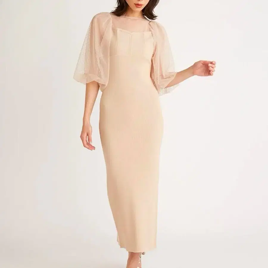 SNIDEL 베이지 쉬폰 퍼프 슬리브 롱 니트 원피스 7부 소매
