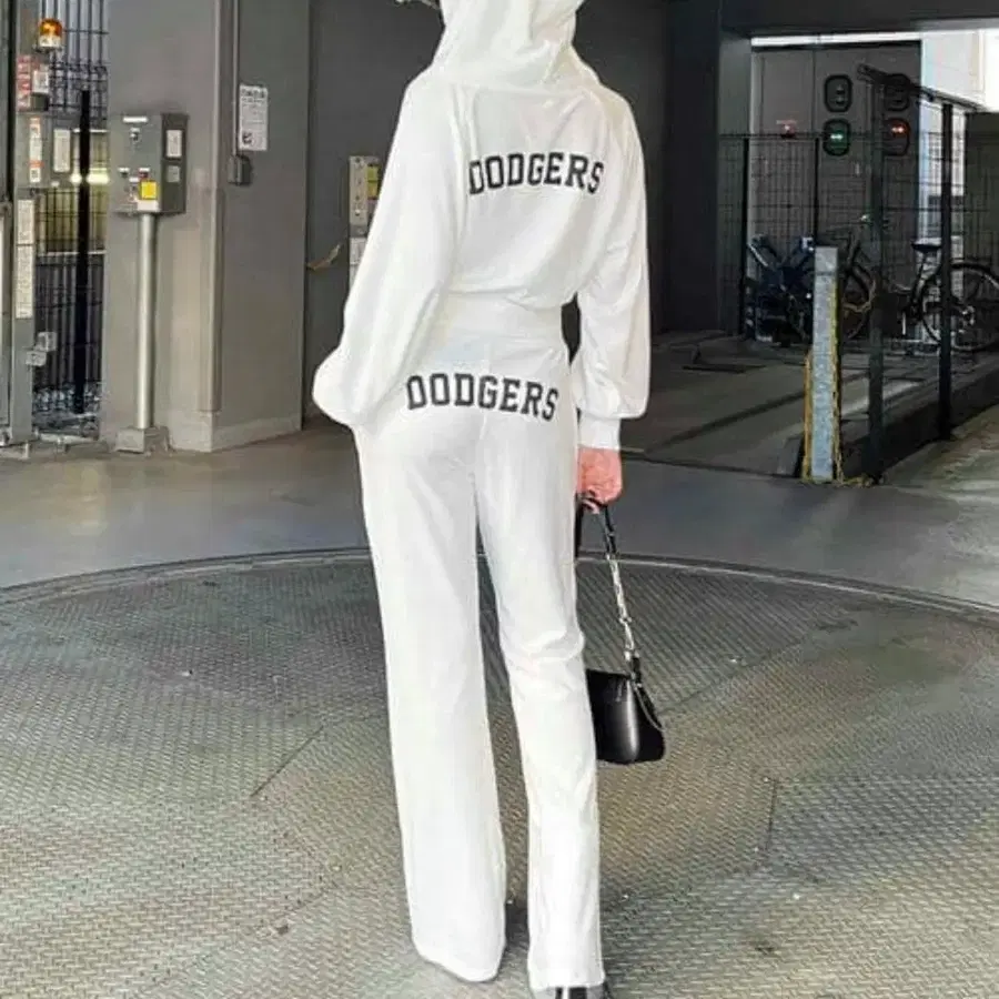 DODGERS 로고가 있는 화이트 후드 부착 셋업, 부드러운 원단으로 쾌적한 착용감.