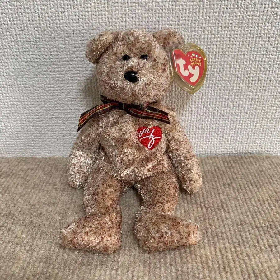 * 이 테디베어는 목에 체크 무늬 리본을 하고 있으며, 가슴에는 빨간색 하트 자수와 [ 2002 ]라는 글자가 쓰여 있습니다.