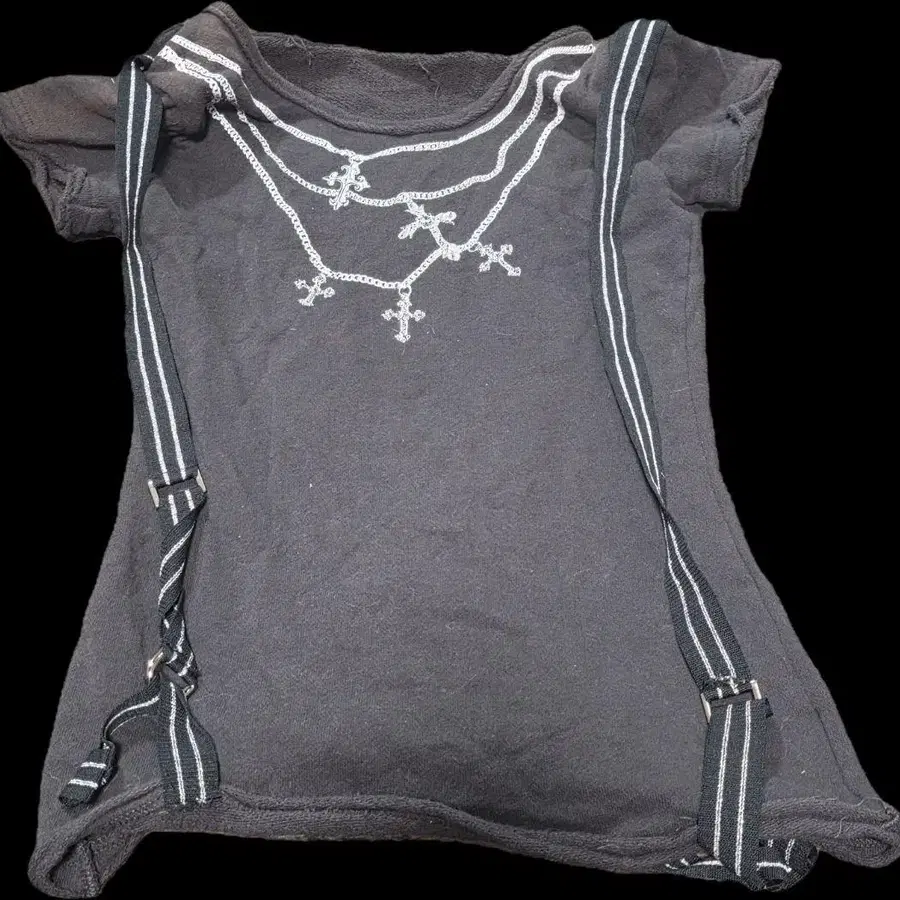 스트라이프 디자인의 스트랩이 달린 블랙 T셔츠, 그래픽 프린트가 특징. - 색상: 블랙 - 디자인: 그래픽 프린트 - 스트랩: 스트라이프 디자인 방문해 주셔서 감사합니다. 자택 보관, 사용감에 이해가 있는 분만 구매 부탁드립니다. 헤이세이 갸루 갸루 d.i.a 다이아 Y2K