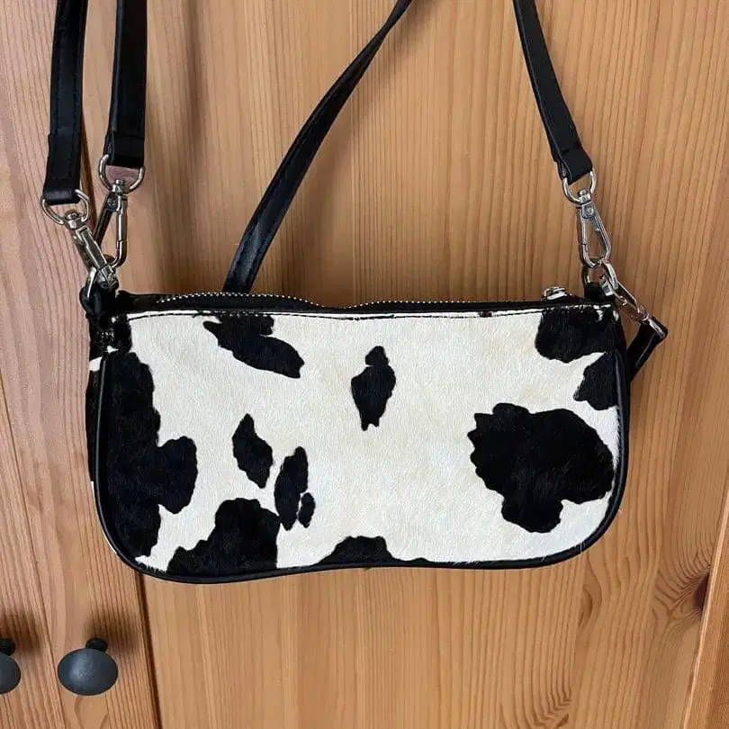 퍼 느낌의 카우 패턴 디자인이 특징인 숄더백. - 색상: 화이트와 블랙 패턴 - 소재: 퍼 느낌의 소재 - 스트랩 타입: 숄더 스트랩 - 디자인: 카우 패턴 - 개폐 타입: 지퍼식 방문해 주셔서 감사합니다.