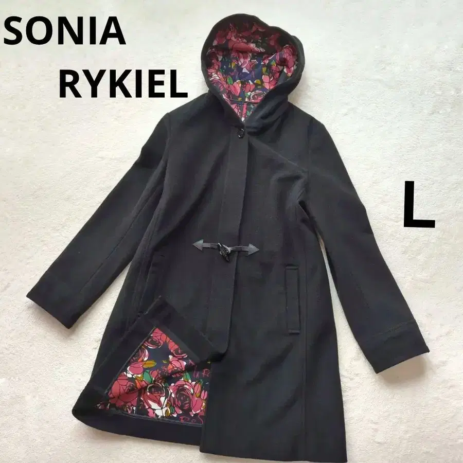 후드 부착된 블랙 롱 코트, 꽃무늬 안감과 소매가 특징입니다.
