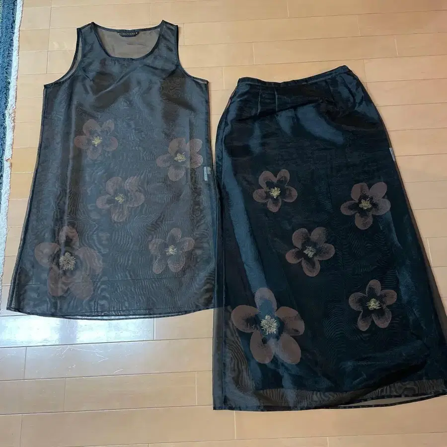 자동 번역되었어요. 원문보기블랙 플라워 프린트가 고급스러운 슬리브리스 튜닉과 스커트 셋업입니다.