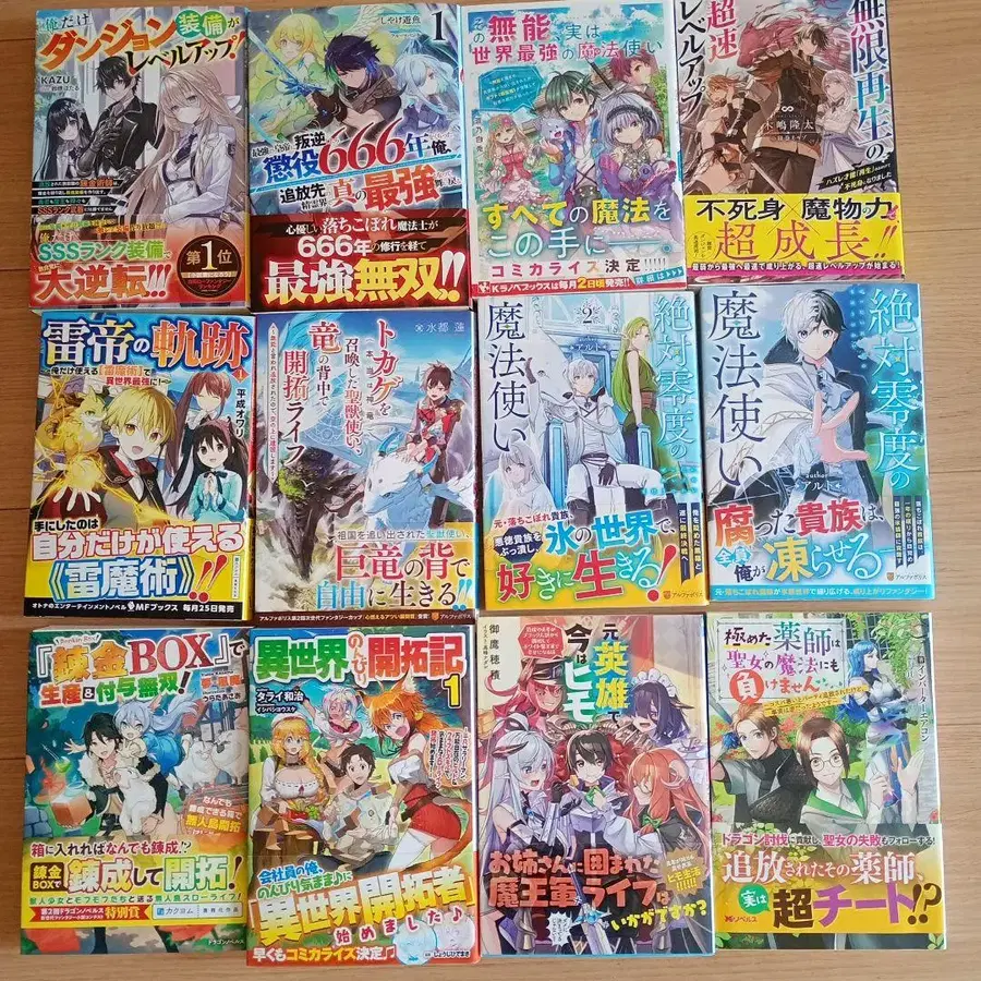 다양한 장르의 라이트 노벨이 포함된 세트. - 타이틀: 던전 장비가 레벨업! - 타이틀: 그 무능은 사실 세계 최강의 마법사 세계 환생 - 타이틀: 뇌제 궤적 1 - 타이틀: 절대 영도의 마법사 1 2 - 타이틀: 무한 재생의 초고속 레벨업 - 타이틀: 도마뱀을 소환한 성수술사, 용의 등에서 개척 라이프 - 타이틀: 연금 BOX로 생산 & 부여 무쌍 - 타이틀: 이세계 느긋한 개척기 1 - 타이틀: 전 영웅은 지금 끈 - 타이틀: 극에 달한 약사는 성녀의 마법에도 지지 않습니다. 방문해 주셔서 감사합니다. 라이트 노벨 2권부터 구매 시 한 권당 100엔 할인해 드립니다. 라이트 노벨 12권 세트 가격은 5000엔입니다. [묶음 구매를 희망합니다]에서 원하는 책을 선택해 주세요. 희망 가격을 5000엔으로 설정해 주시면 감사하겠습니다.