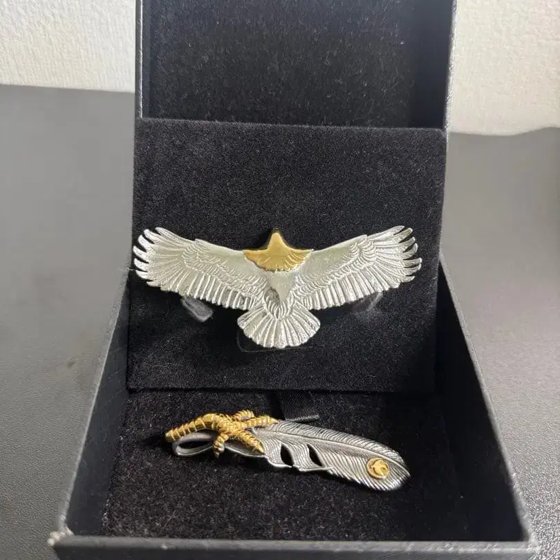 이글 페더 펜던트 목걸이 실버 중량감 있는 실버 소재로 제작되었습니다. 몇 번 착용하지 않아 흠집도 적습니다. 고로즈나 실버 액세서리를 좋아하는 분께 추천합니다. 독특한 독수리 디자인의 금속제 브로치 세트, 실버와 골드의 콤비네이션. - 디자인: 독수리 모양의 브로치 - 소재: 금속제 - 색상: 실버, 골드 - 스타일: 유니크한 디자인 - 부속품: 전용 박스 포함 방문해 주셔서 감사합니다.