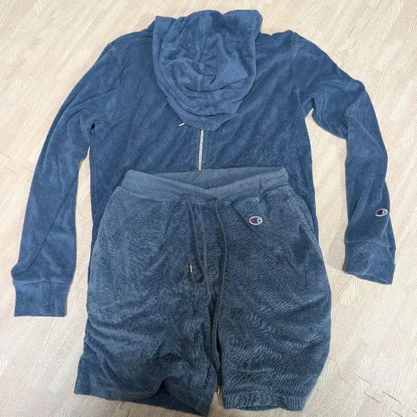 플리스 소재의 다크 블루 후드 부착 자켓과 숏팬츠 세트. - 브랜드: Champion - 색상: 다크 블루 - 소재: 플리스 - 스타일: 후드 부착 자켓과 숏팬츠 세트 - 포켓: 숏팬츠에 포켓 있음. 방문해 주셔서 감사합니다. 바지 쪽에 색바램이 보입니다. 양해 후 구매 부탁드립니다.