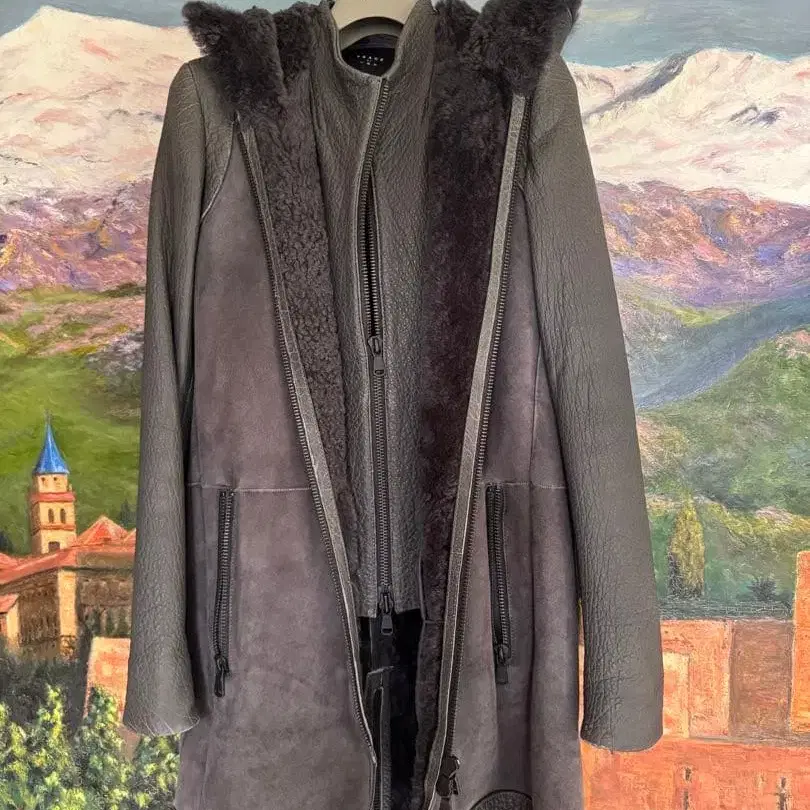 그레이 무스탕 코트 후드 부착