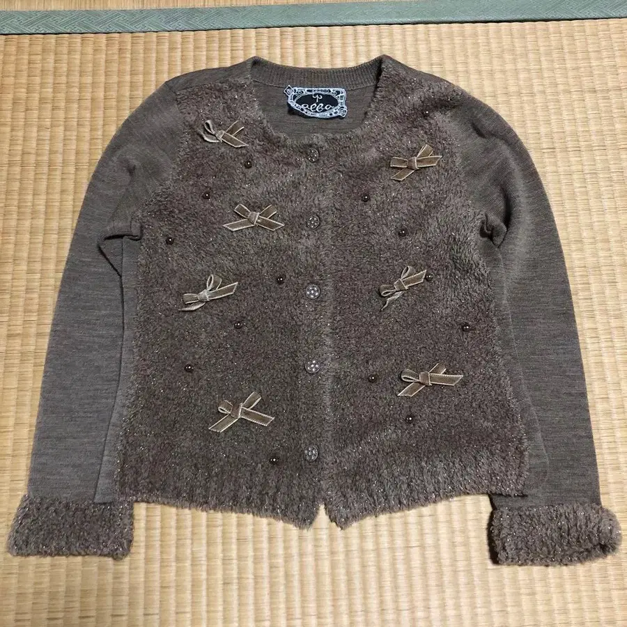 가디건 리본 비즈 브라운 울 니트 스웨터