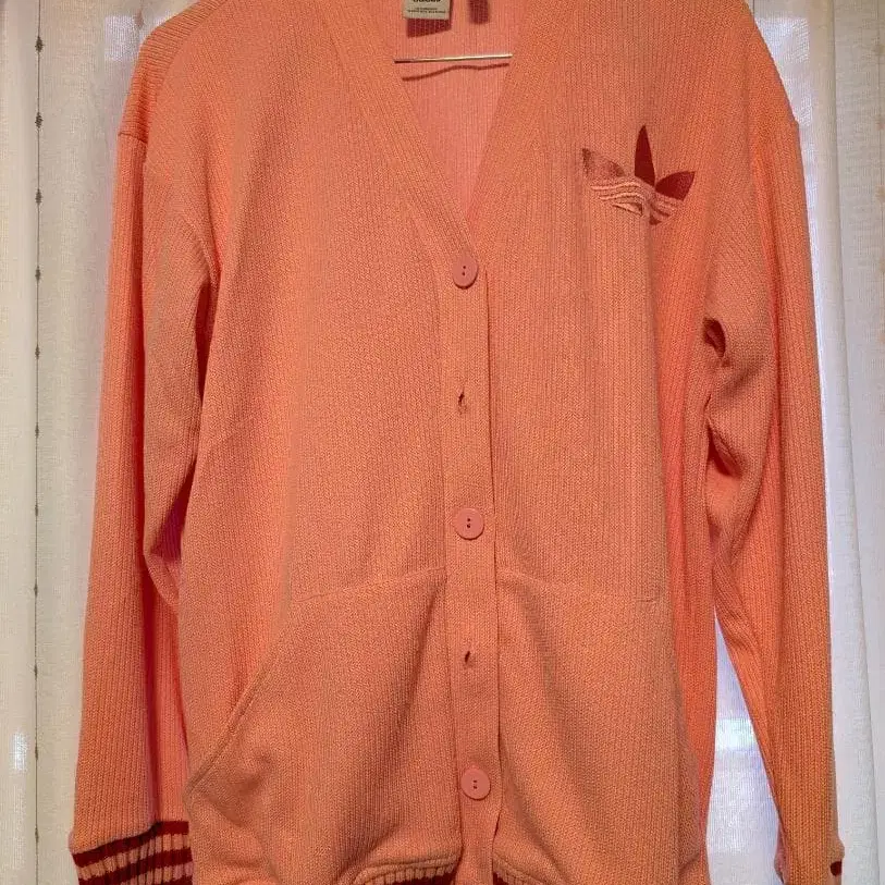 자동 번역되었어요. 원문보기핑크색 adidas 가디건, 버튼이 있고 포켓이 있습니다.