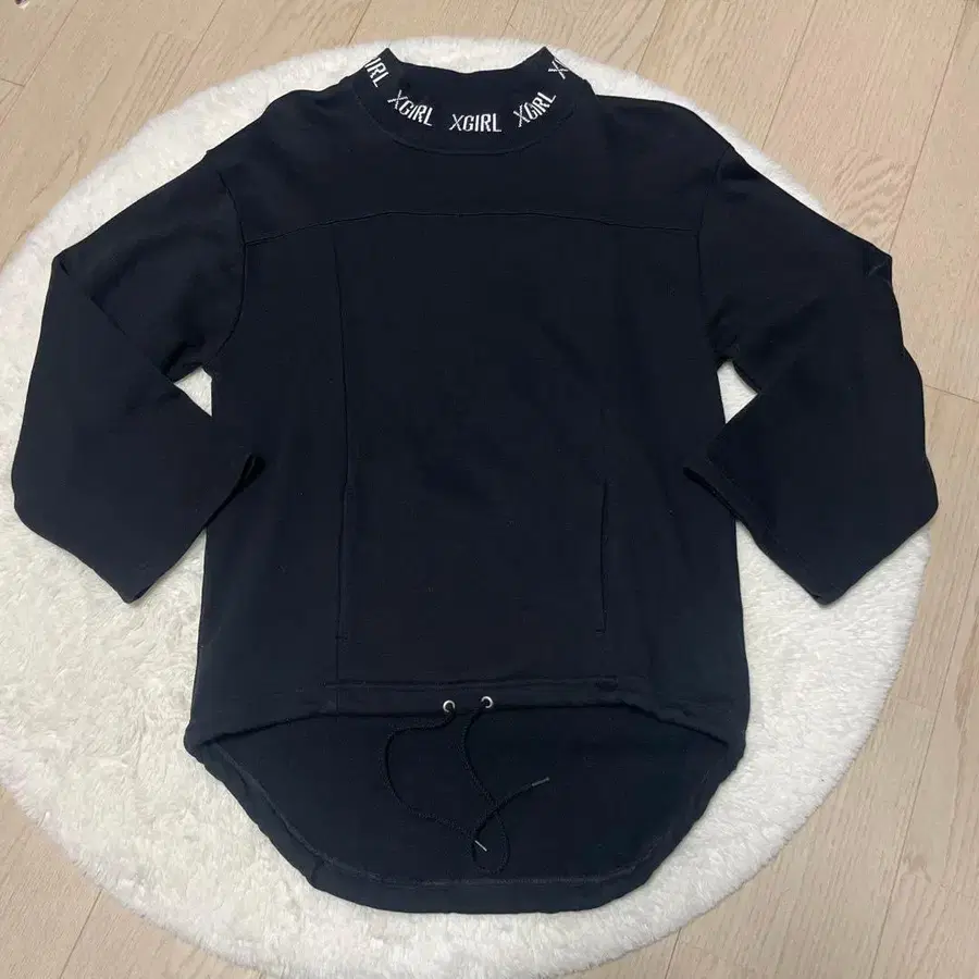 X-girl 하이넥 디자인의 블랙 트레이닝복, 드로우 스트링으로 스타일리시합니다.