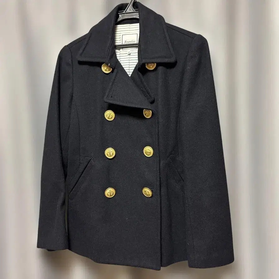 울 90% 더블 브레스트 피코트, 골드 버튼이 달린 심플하고 엘레강트한 디자인. - 브랜드: Anatelier - 사이즈: 38 - 소재: 울 90%, 나일론 10% - 색상: 블랙 - 디자인: 더블 브레스트, 골드 버튼 방문해 주셔서 감사합니다.