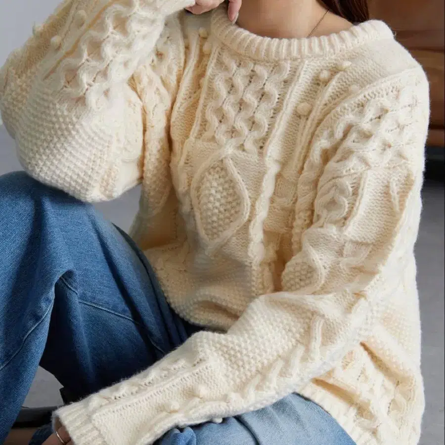 빈티지 페어아일 패턴 플라워 모티브 입체 자수 케이블 니트
