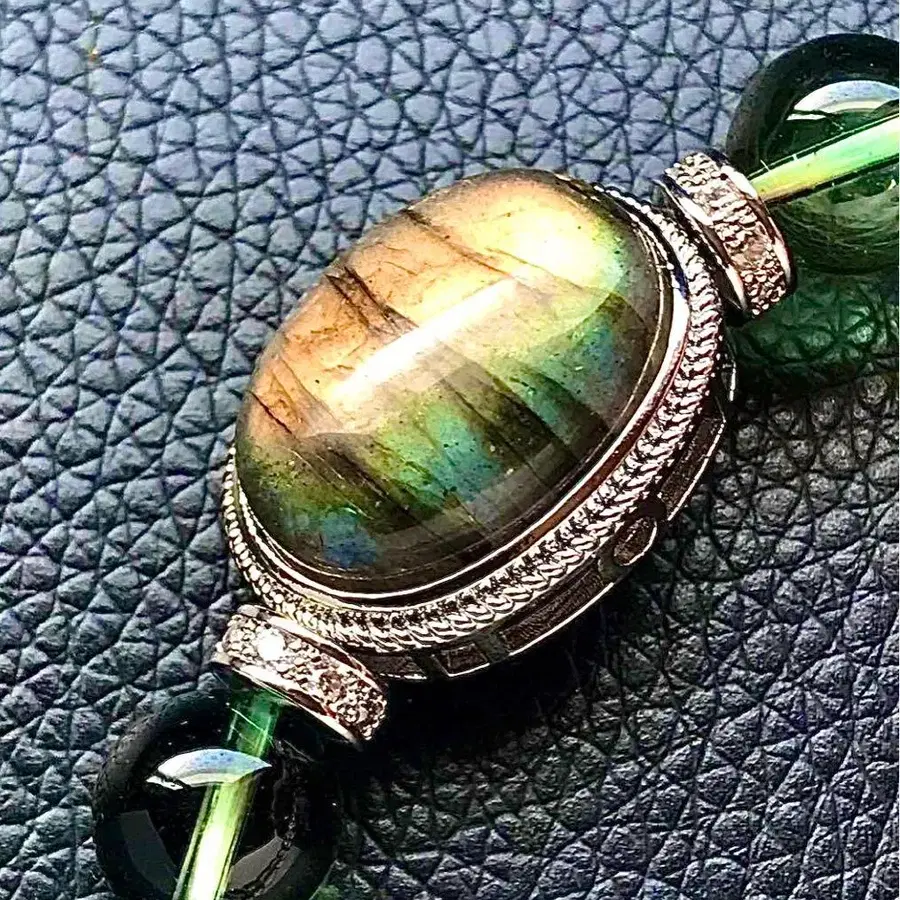 연마한 타원형 천연 래브라도 라이트 양 끝에 그린 유리를 끼우고 미러볼 컷 수정으로 연결한 엘레강트한 팔찌. 실버 금장 장식 사용 래브라도 라이트 탑만으로 팔찌에서 목걸이로도 활용 가능. - 소재: 래브라도 라이트, 그린 유리 - 디자인: 타원형, 장식적인 실버 금장 장식 - 디자인: 연꽃 모티브 장식 - 색상: 그린, 실버 - 스타일: 캐주얼, 엘레강트 방문해 주셔서 감사합니다.