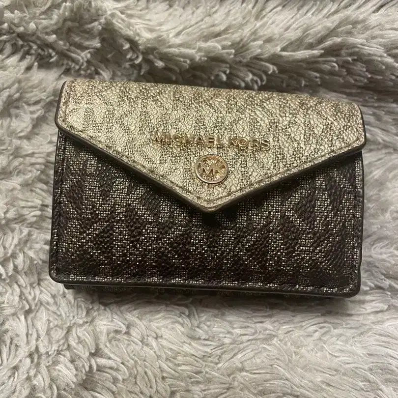 골드와 브라운의 3단 폴더형 지갑, 내부에 약간의 흠집 있음.