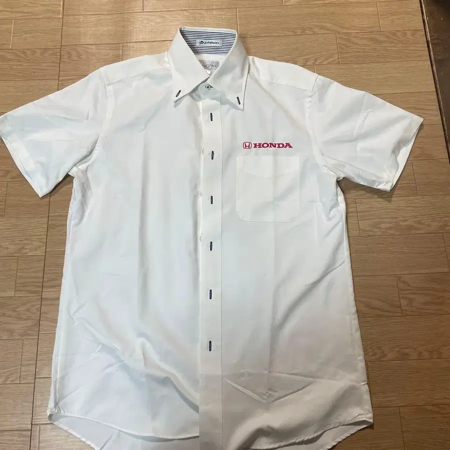 혼다 로고가 새겨진 화이트 L 사이즈 워크 셔츠. 스트라이프 옷깃이 특징입니다.