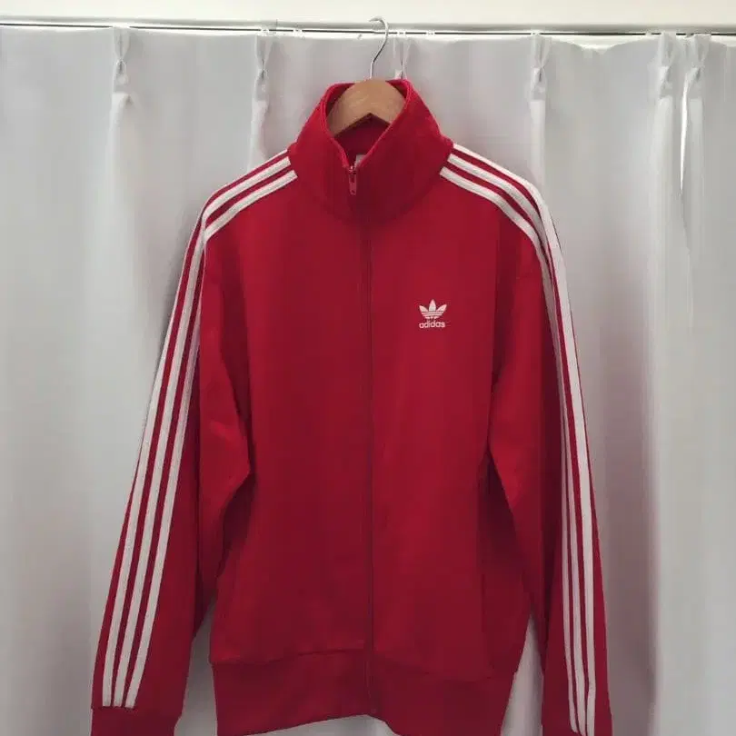 선명한 레드의 adidas 집업 자켓, 3본 라인 디자인과 자수 로고가 특징. - 브랜드: adidas - 색상: 레드 - 디자인: 3본 라인 디자인 - 로고: 자수 로고 - 스타일: 집업 자켓 방문해 주셔서 감사합니다.