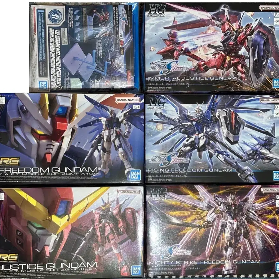 모두 미개봉 새상품이지만, 개인 보관으로 인해 미세한 스크래치나 찍힘 등이 보일 수 있습니다. 중고품임을 이해해주시는 분만 구매 부탁드립니다. RG 프리덤 건담 RG 저스티스 건담 HG 라이징 프리덤 건담 HG 임모탈 저스티스 건담 HG 마이티 스트라이크 프리덤 건담 액션 베이스 SEED FREEDOM 이미지 클리어 컬러