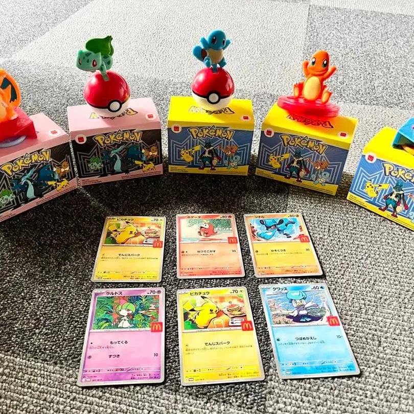 포켓몬 피규어와 카드 세트, 맥도날드 한정 상품. - 캐릭터: 포켓몬 - 피규어: 리자몽, 꼬부기, 이상해씨 - 카드: 피카츄, 파이리, 물오리, 이상해씨, 마릴, 팽도리 - 패키지: 맥도날드 - 수량: 피규어 3개, 카드 6장 방문해 주셔서 감사합니다. 발송 시에는 상자에서 꺼내서 발송합니다! 카드와 완구 모두 사진 촬영을 위해 개봉했으므로 새상품급입니다 ♩ 포켓몬 포켓몬 카드 트레이딩 카드 한정판 프로모션 피규어