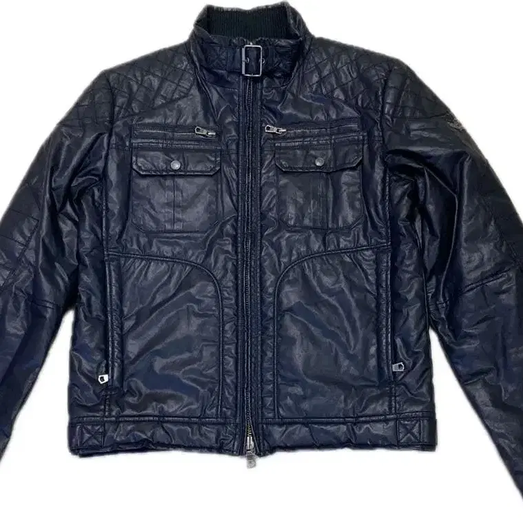 ■ 스로트 벨트가 달린 스탠드 카라, 앞 더블 슬라이더 풀 집업, 프론트 세로 지퍼 포켓, 플랩이 있는 가슴 포켓, 그 위에 가로 지퍼 포켓, 안쪽 포켓 2개, 어깨 패드 없음, 소매 지퍼 플리츠, 로고 각인 지퍼 슬라이더를 사용한 패딩 자켓입니다.
