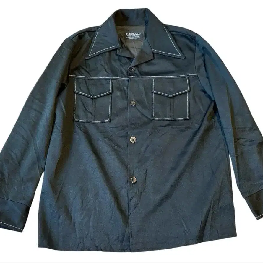 1970년대 오픈 카라 프론트 포켓 부착 블랙 캐주얼 셔츠, 폴리에스테르 소재에 스티치가 특징인 빈티지 셔츠입니다.