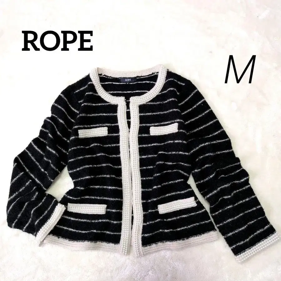 ROPE 펄 장식 니트 가디건 보더 블랙 트위드풍 울
