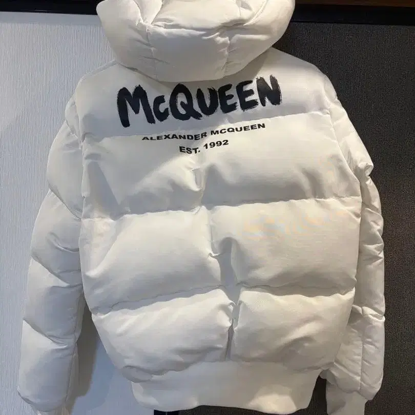 자동 번역되었어요. 원문보기화이트 패디드 자켓, 백에 브랜드 로고가 새겨져 있습니다.