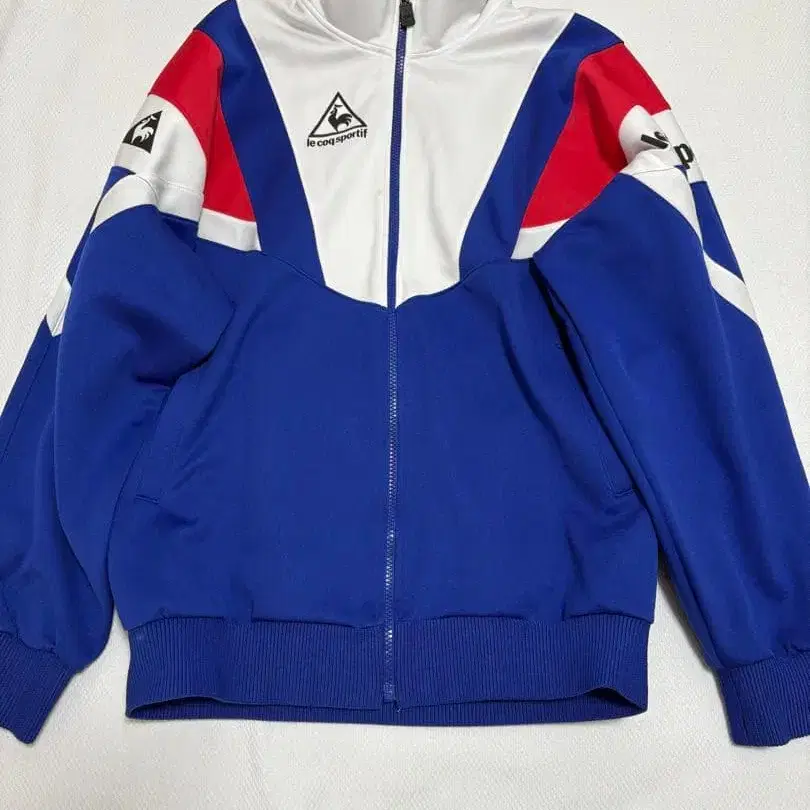 90년대 레트로 디자인의 집업 자켓, 선명한 파랑과 빨간색의 배색이 특징. - 브랜드: le coq sportif - 연대: 90's - 색상: 파랑/화이트/빨간색 - 디자인: 집업 자켓 - 스타일: 스포츠 저리