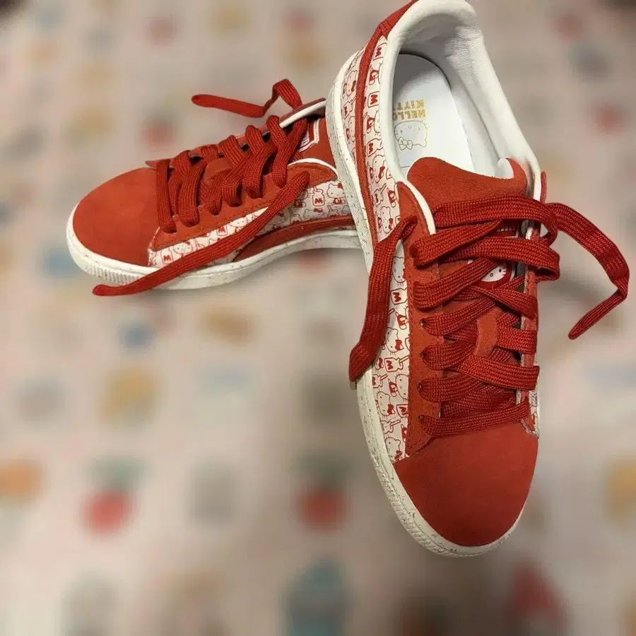 헬로키티 프린트가 들어간 빨간색 스웨이드 스니커즈. - 색상: 빨간색 - 디자인: 헬로키티 프린트 - 소재: 일부 스웨이드 - 스타일: 캐주얼 - 신발 타입: 스니커즈 방문해 주셔서 감사합니다. 구매 후, 한 번 신어본 상품입니다. 색상 - 레드 계열