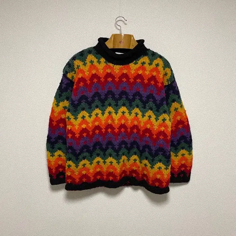 80s 에콰도르 니트 핸드 니트 울 스웨터 레인보우 패턴