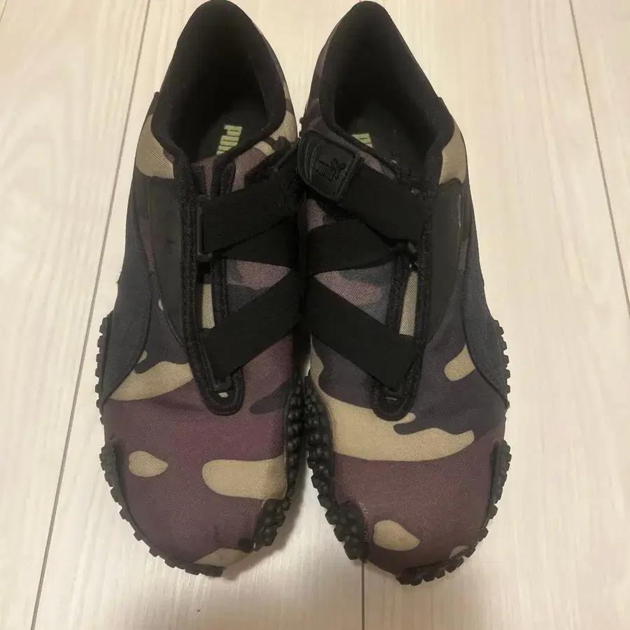 카모플라쥬 디자인의 푸마 스니커즈, 벨크로 스트랩과 스파이크 밑창이 특징입니다.