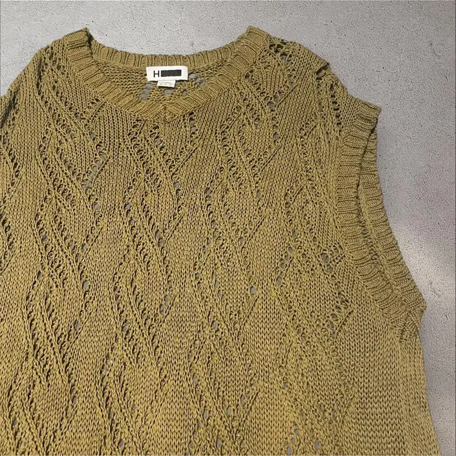 큼직하게 짜 올린 V넥 베스트입니다. 소재는 내추럴한 표정의 로실크와 코튼을 블렌드하여 드라이 터치로 마무리한 실을 채용했습니다. 케이블 무늬를 모티브로 한 시스루 짜임.