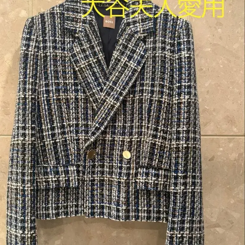 자동 번역되었어요. 원문보기네이비 계열 체크 더블 브레스트 테일러드 자켓, 트위드풍 소재로 스타일리시한 크롭 기장.