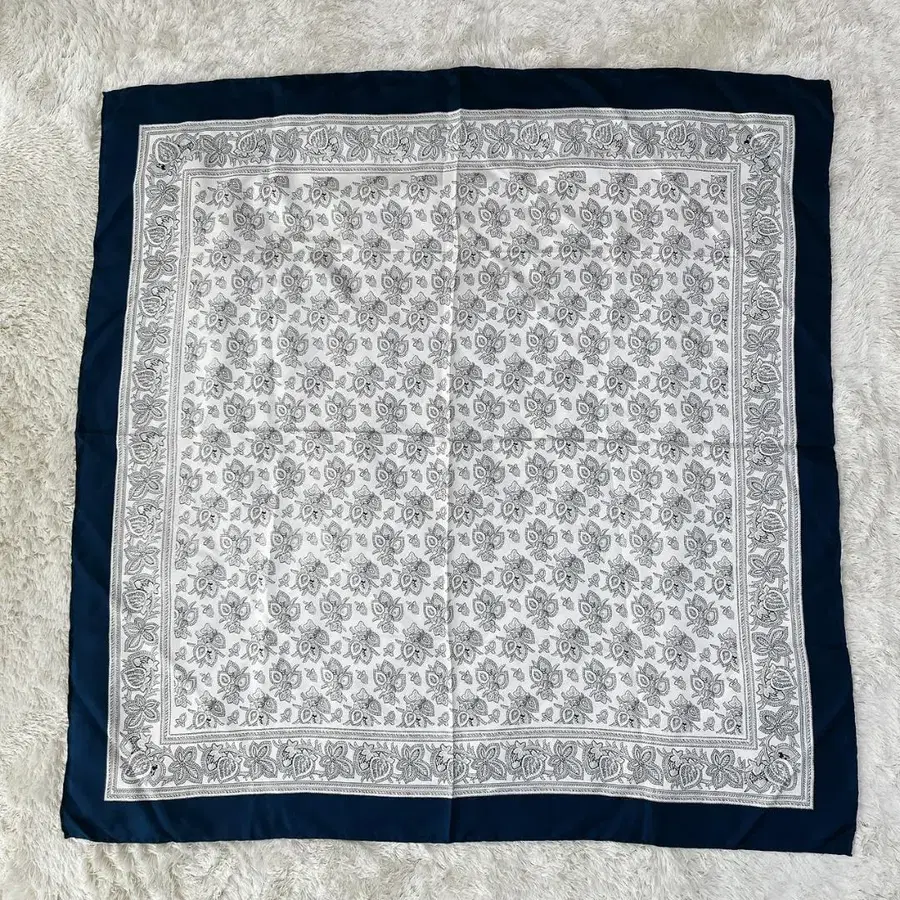 고급스럽고 클래식한 느낌의 실크 스카프입니다. 화이트 베이스에 섬세한 꽃무늬가 그려져 있으며, 네이비 색상의 테두리가 전체적인 디자인을 깔끔하게 잡아줍니다. 실크 특유의 부드러운 촉감과 고급스러운 광택감이 매력적입니다. 목에 두르는 것 외에도 가방이나 헤어 액세서리로도 활용할 수 있습니다.