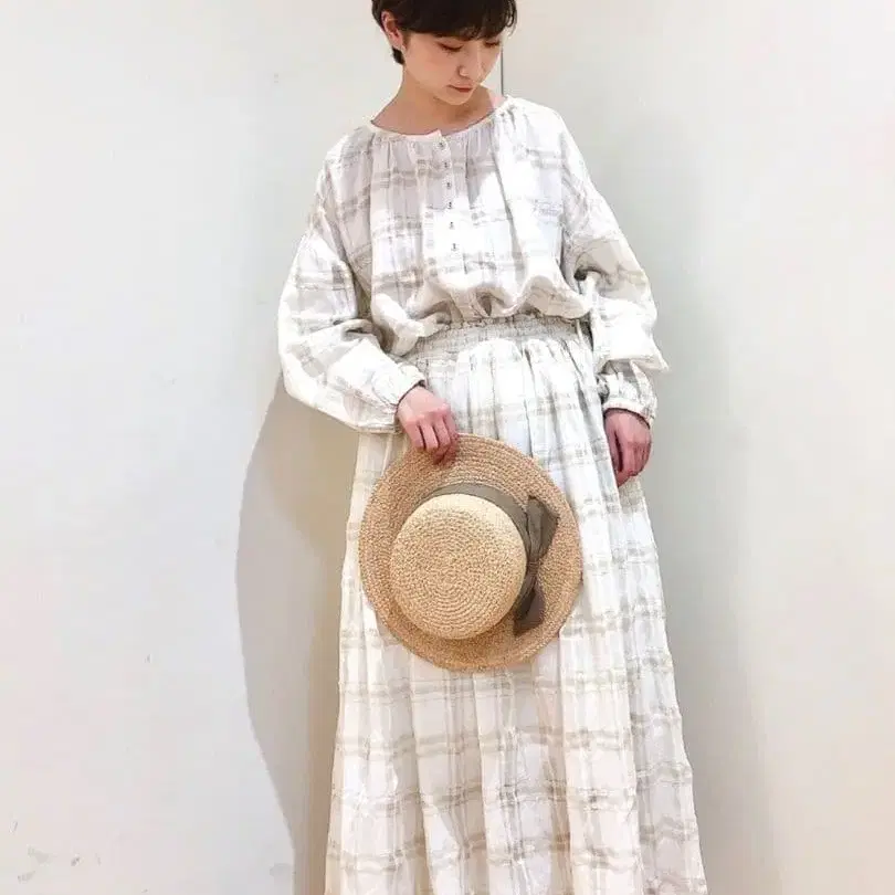 SM2 라메사 체크 무늬 블라우스와 스커트 셋업 화이트 새상품급