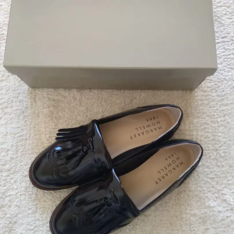 프린지 장식의 블랙 로퍼, 스타일리시하고 다용도. 거의 신을 기회가 없어 얼룩이나 발꿈치 마모가 적습니다. 광택이 나는 에나멜 블랙입니다. - 브랜드: 마가렛호웰 아이디어 - 색상: 블랙 사이즈 22cm - 스타일: 로퍼 - 특징: 프린지 장식 디자인 - 부속품: 박스 포함