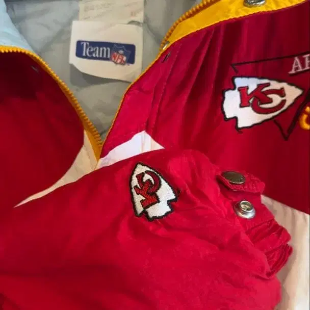 자동 번역되었어요. 원문보기캔자스 시티 치프스 다운 자켓, AFC와 NFL 로고 자수 포함.