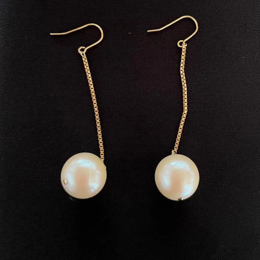 수지 펄과 골드 후크 귀걸이 - 소재: 수지 펄과 금속 - 디자인: 체인이 달린 후크 귀걸이 - 사이즈: 펄 직경 약 1.5cm - 길이: 약 7.5cm (개인차가 있지만, 착용 시 턱 아래 정도의 길이입니다.) 방문해 주셔서 감사합니다. 수지 펄의 색상은 크림색으로, 태양광과 실내에서 색감의 보이는 방식이 다릅니다. 귀걸이 모양 - 후크, 체인 부속품 - 부속물 없음 흠집, 변색 등 - 없음 #H.P.FRANCE #아쉬 페 프랑스 #MAYU 색상 - 화이트 계열 색상 - 골드 계열