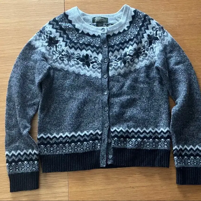 Eddie Bauer 에디 바우어 노르딕 무늬 비즈 자수 울 니트 가디건 사이즈 기장 54cm, 가슴 너비 45cm, 화장 75cm 소재 울 78%, 나일론 22% 색상 - 블랙 계열 소재 - 울 넥 - 크루넥/U넥 계절 - 가을/겨울 얼룩, 찢김, 냄새 등 - 없음 니트 Used 제품 특성상 보풀은 다소 있지만, 눈에 띄는 얼룩이나 데미지는 없습니다.