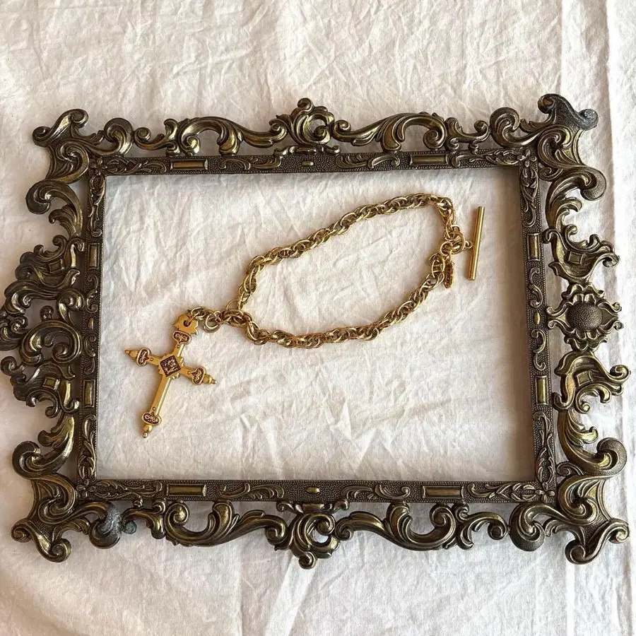방문해 주셔서 감사합니다.* INGEBORG ( 잉게보그 ) 빈티지 시기의 크로스 모티브 목걸이입니다. * 액자는 포함되지 않습니다. 현행에는 없는, 중후한 느낌과 클래시컬한 분위기가 매력적인 디자인. 앤티크풍의 골드 컬러와 섬세한 장식이 매우 고급스럽습니다. [ 사이즈 ] 체인 길이: 약 38cm 크로스 모티브: 약 7cm [ 컬러 ] 골드 [ 브랜드 ] INGEBORG ( 잉게보그 ) 장기 보관되었던 상품이므로, 금속 특유의 탁함이나 약간의 흠집 등 노후화에서 오는 질감이 있습니다. 빈티지 액세서리를 좋아하시는 분께 추천합니다. ( 눈에 띄는 데미지는 없습니다 ) 코디네이트의 포인트가 되는 존재감 있는 목걸이입니다.* 정성껏 포장하여 발송하겠습니다. 즉시 구매 환영합니다. 잉게보그의 자켓도 판매 중입니다 ♪ 괜찮으시면 둘러봐 주세요.