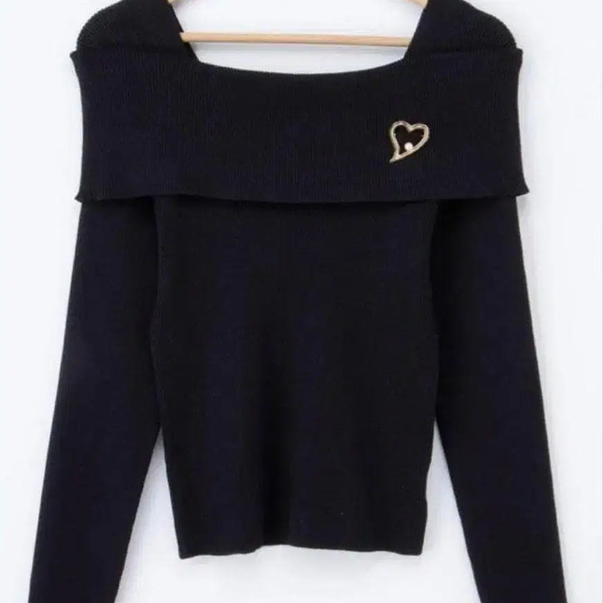 리브 니트 오프숄더 스웨터, 하트 모양 브로치 포함.