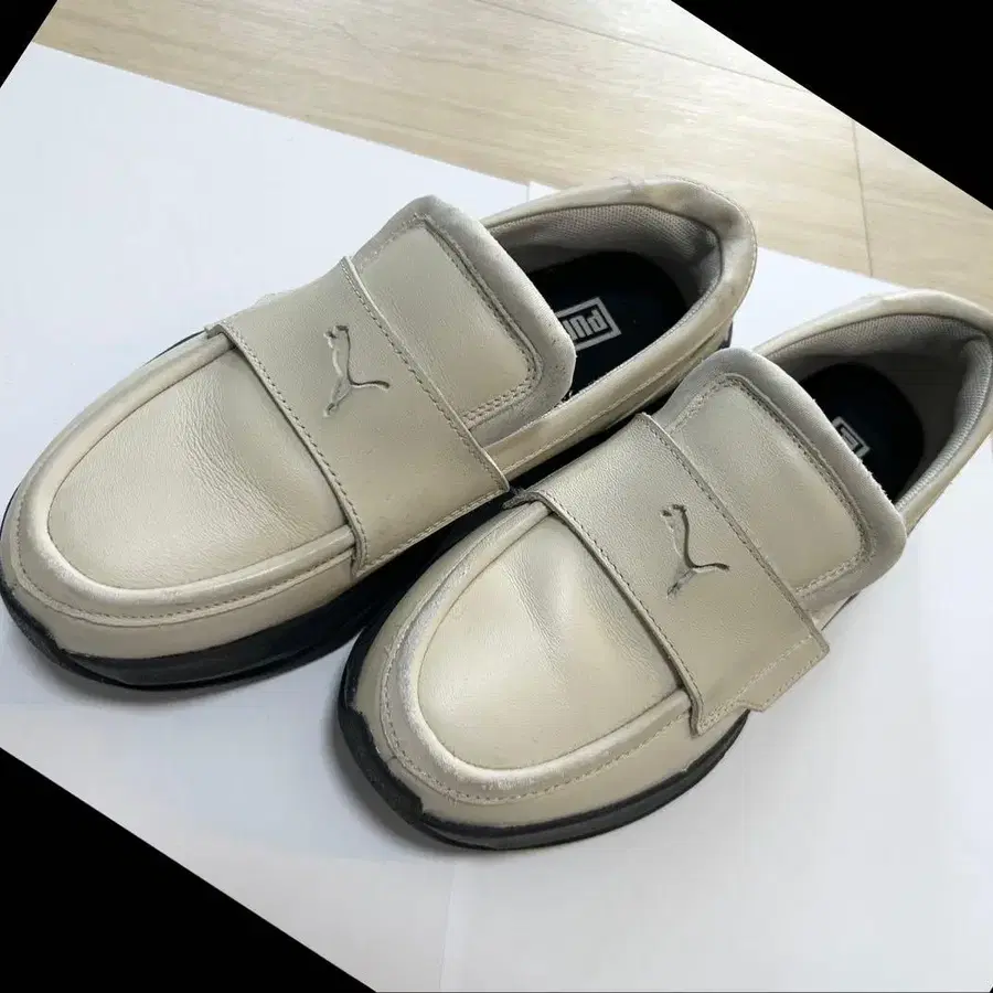 PUMA의 로퍼 스니커즈입니다. 색상은 베이지입니다. 걷기 편해서 몇 번 신었지만, 신발이 너무 많아져서 판매합니다. 사진과 같이 일부 스크래치가 있지만, 베이지색이라는 특성상 착용 시에는 거의 눈에 띄지 않습니다. 많이 사용하지 않아서 밑창 등은 상당히 깨끗합니다.