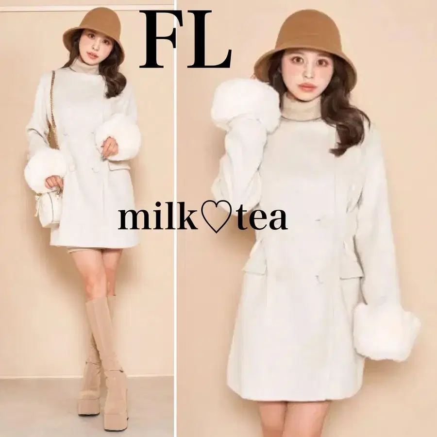택 포함 새상품 다리치 소매 퍼 체크 디자인 코트 FL 아이보리