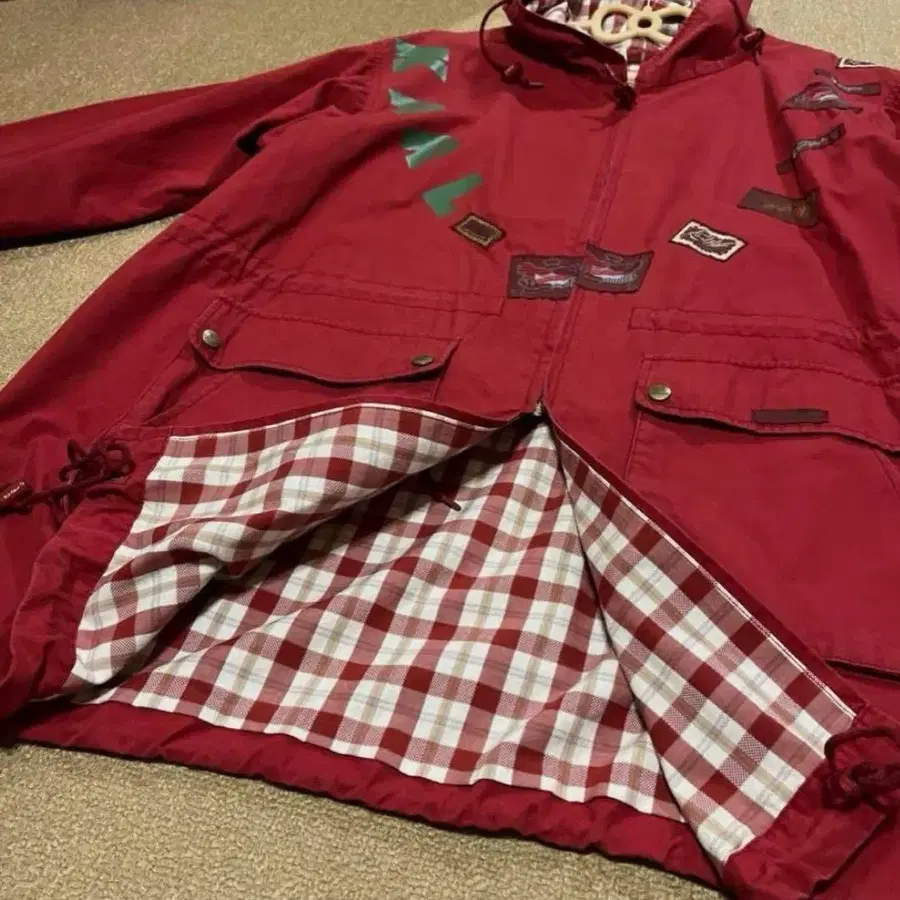 빨간색 체크 무늬 안쪽을 가진, 포켓 4개가 달린 점퍼.
