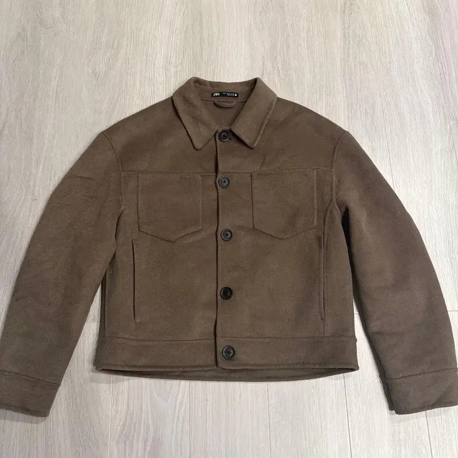 브라운 색상의 버튼이 달린 자켓, 포켓이 있어 스타일리시합니다.