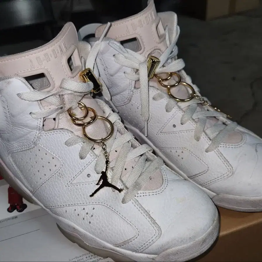 가죽 소재의 화이트 스니커즈, 골드 참 포함. - 브랜드: Jordan - 사이즈: US 10 - 색상: 화이트 - 모델: 6 - 장식: 골드 참 포함 - 소재: 가죽 방문해 주셔서 감사합니다.