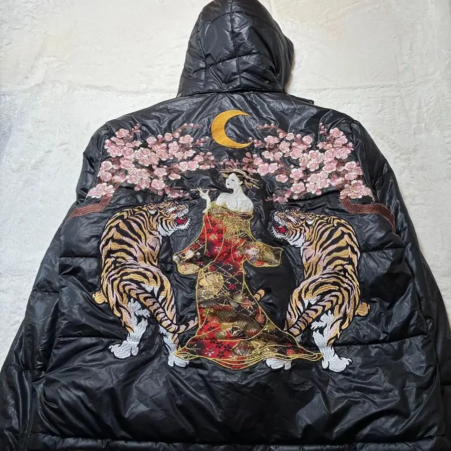 일본풍 패턴 불취타이 호랑이 자수 다운 자켓 백 디자인 블랙