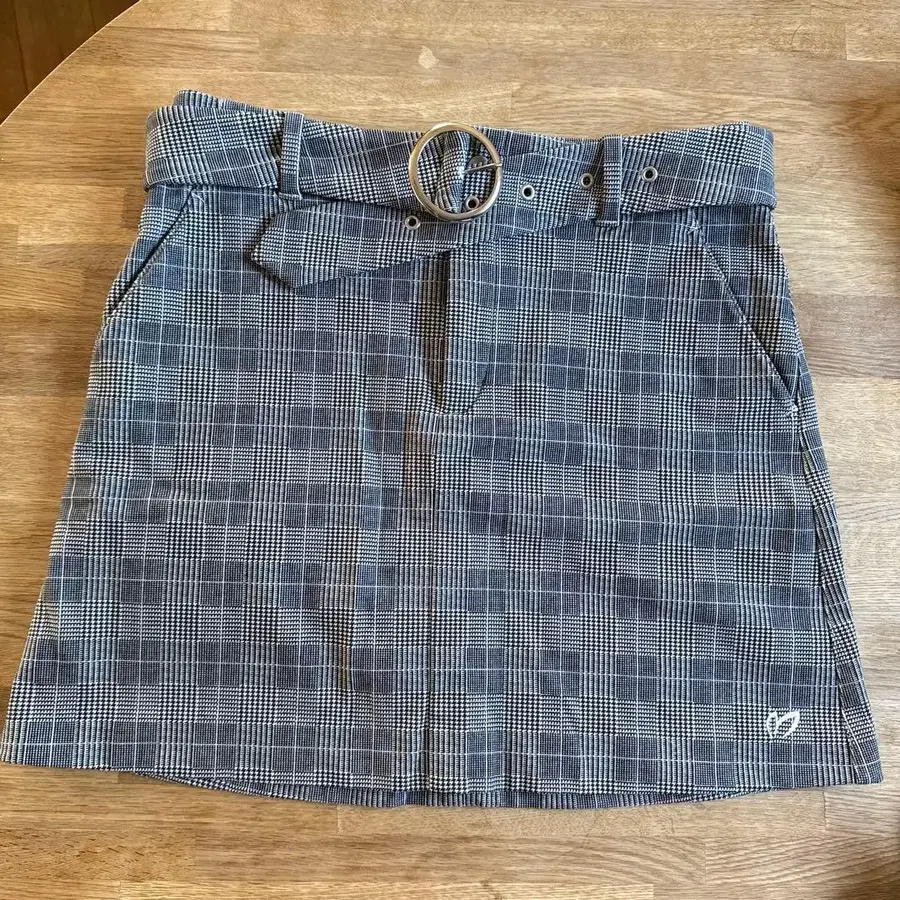 체크 무늬 링 벨트 스커트, 사이드 포켓 있음. 몇 번 착용 기장 42cm 허리 38cm (평평하게 놓음) - 디자인: 체크 무늬 - 벨트: 링 벨트 포함 - 로고: 자수 로고 있음 - 포켓: 사이드 포켓 포함 - 이너 있음 (얇은 소재) 방문해 주셔서 감사합니다.