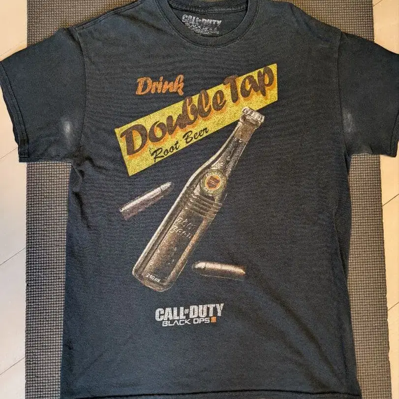 프론트에는 게임 내 아이템 'DOUBLE TAP Root Beer'가 크게 프린트되어 있으며, BO 시리즈 팬들에게도 높은 지지를 받는 디자인입니다. 밀리터리 게임 계열의 프린트 티셔츠를 찾으시는 분들께도 추천합니다.
